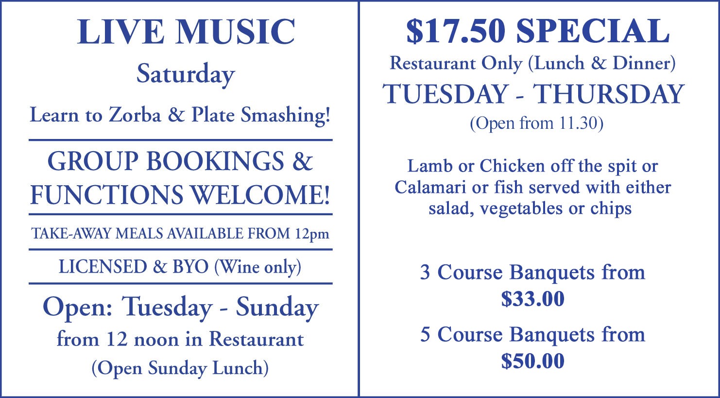 | CHICKEN OFF THE SPIT | $17.50 | $25.50 | $42.00 |